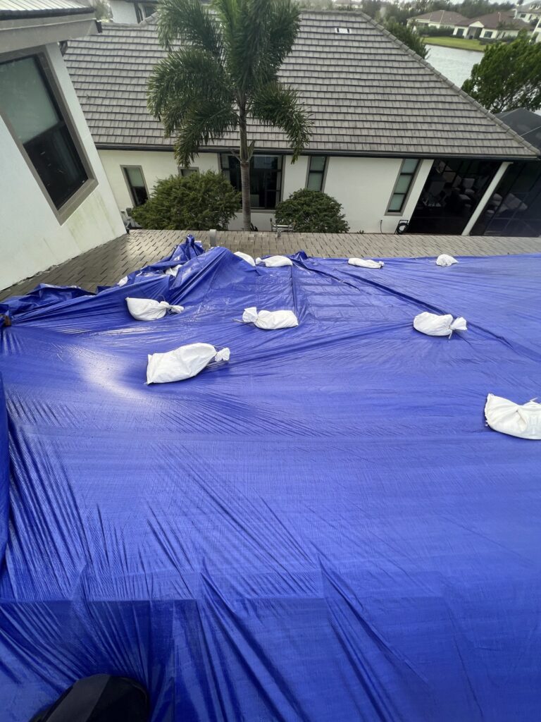 Emergency leak response with tarps, shrink wrap, and temporary protection.